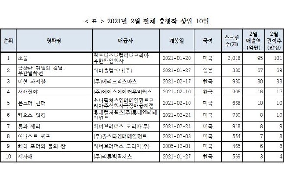 2월 월별 박스오피스 1위는 디즈니 애니메이션 ‘소울’이 지난 1월에 이어 두 달 연속으로 전체 1위를 달성했다. 소울은 재즈 피아니스트 주인공이 ‘음악’이란 소재로 ‘일상의 행복’에 대해 이야기하는 내용의 작품으로 가족 단위 관객과 성인 관객층까지 포섭한 것으로 분석됐다.