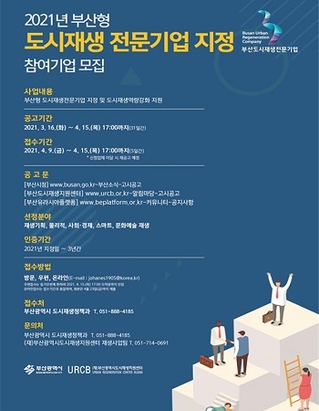시는 이번 공모를 통해 연간 5000~6000억원 규모로 추진하는 도시재생 뉴딜사업을 비롯한 부산시의 도시재생사업 전반에 지역기업의 적극적인 참여를 견인한다는 계획이다. 또 ‘부산형 도시재생’을 선도하는 도시재생 전문기업을 육성한다는 방침이다.