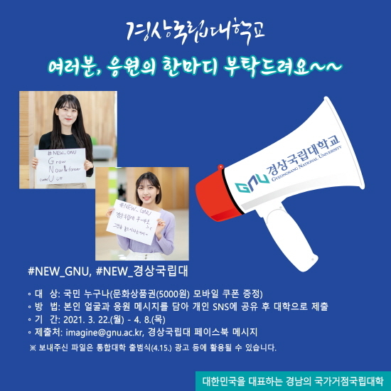 참여방법은 간단하다. ‘#NEW_GNU’ 또는 ‘#NEW_경상국립대’ 해시태그를 이용하여 응원의 글귀를 적은 뒤 사진을 촬영한다. 사진은 개인 SNS에 올리고 경상국립대로 보내면 된다. 마감일은 4월 8일이다.