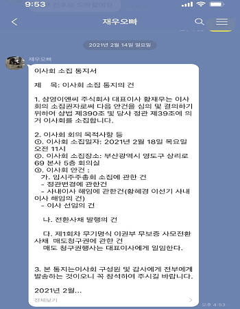 그러면서 황 사내이사는 “황재우 대표가 60억 콜옵션의 매도청구권을 대표이사에 일임한다는 안건으로 이사회를 소집했다”며 “그러나 이사회 구성원의 반대로 재차 부결되자 황재우 대표가 소수주주와 공모해 주주제안을 했다”고 주장했다.