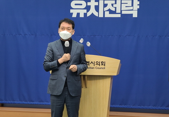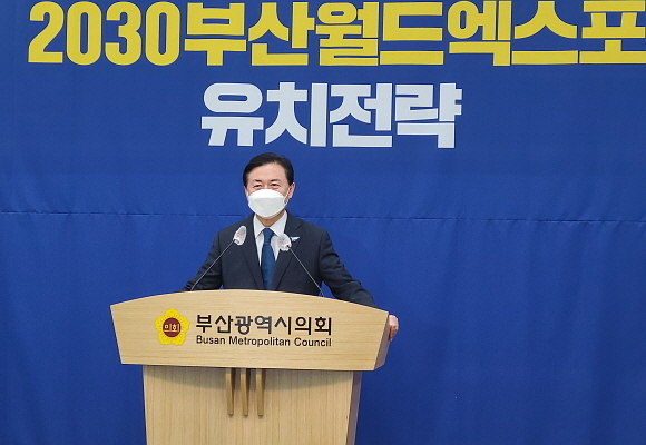 김영춘 부산시장 후보(더불어민주당)가 22일 오전 10시 부산시의회 브리핑실에서 기자회견을 열고 ‘2030 월드엑스포’의 성공 유치를 위한 공약 계획을 발표했다.
