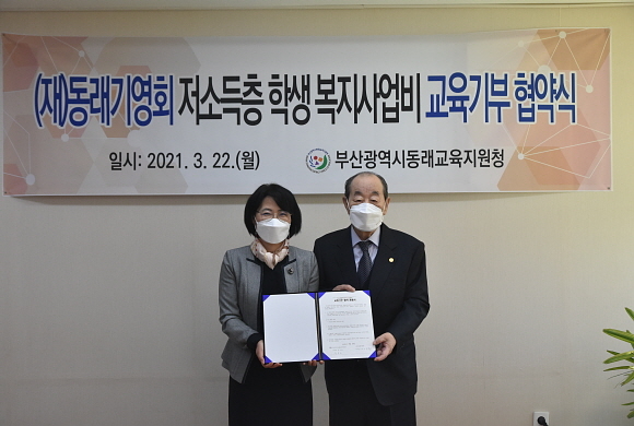 부산시동래교육지원청이 지난 22일 오전 본청 교육장실에서 (재)동래기영회와 저소득층 학생 복지사업 지원을 위한 ‘교육 기부 협약’을 체결했다고 23일 밝혔다.
