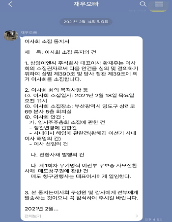 정관상에 전환사채 발행 규모 한도가 100억인 것은 당연히 알고 있다. 그런데 황재우 대표가 소집통지한 지난달 18일자 이사회 안건을 보면 임시주총을 열어 정관 변경을 하는 안건이 먼저 상정돼 있고 그 이후에 전환사채의 안건이 있다. 그 안건의 순서를 보면 황재우 대표가 회사 정관까지 변경해 회사에 무리가 가는 300억원의 전환사채를 발행하는 소집통지를 했다는 것을 알 수 있다. 백번 양보해 전환사채의 규모는 그 소집통지에 나와 있지 않으나 이미 발행한 100억 전환사채의 60억원 매도청구권의 분배 권한을 황재우 본인에 일임한다는 것은 소집통지에 분명히 명기돼 있다. 소수주주님들께 거짓 약속을 한 것이 분명한 부분임을 확인할 수 있다.