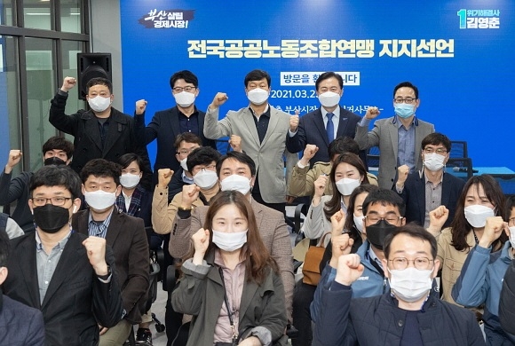 전국공공노조연맹 류기섭 위원장과 김현석 부산본부 의장을 비롯한 40여명의 조합원은 김영춘 후보 선거캠프에 모여 공식 지지를 선언했다.