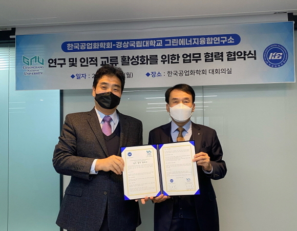 경상국립대학교(GNU) 그린에너지융합연구소와 한국공업화학회는 지난 22일 한국공업화학회 사무실에서 에너지 분야 인재 양성 및 연구 교류 등 상호 협력의 필요성을 인식하고 업무협약을 체결했다.