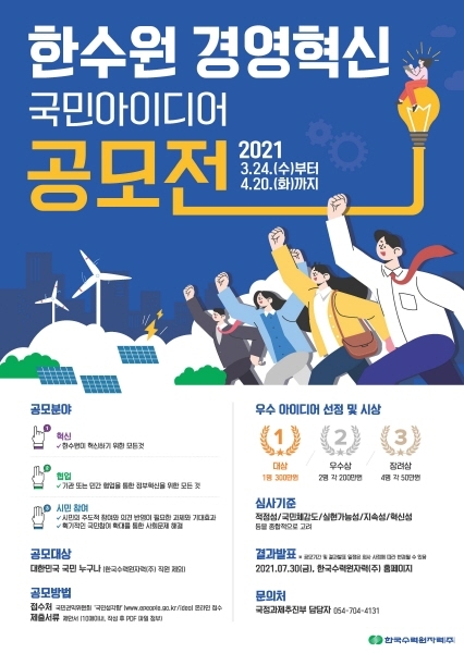 한국수력원자력(이하 한수원)이 국민 소통을 통한 경영혁신을 위해 ‘2021 한수원 경영혁신 국민 아이디어 공모전’을 시행한다.
