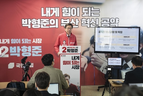 박형준 부산시장 후보가 25일 오후 2시 선거사무소에서 기자회견을 열고 그간 발표했던 공약의 종합 개요와 실천방안 등을 설명하고 있다. (박형준 후보 캠프©)
