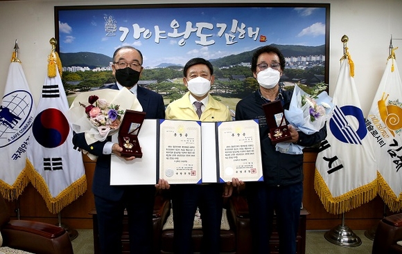 경남 김해시는 25일 시장실에서 '6·25참전유공자 무공훈장 찾아주기 사업'의 일환으로 허성곤 시장이 국방부장관을 대신해 참전유공자 자녀에게 화랑무공훈장을 전달하는 전수식을 가졌다.
