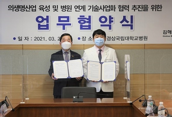 김해의생명산업진흥원과 창원경상국립대학교병원이 지난 24일 김해시 의생명산업 육성 및 병원 연계 기술사업화 협력을 목표로 창원경상대병원에서 업무협약(MOU)을 체결했다.
