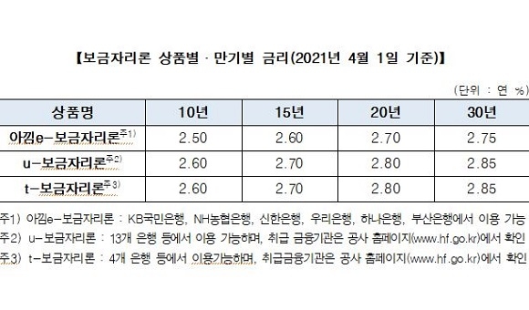 이에 주금공 홈페이지에서 신청하는 'u-보금자리론‘과 은행 창구에서 신청하는 ’t-보금자리론‘은 내달 1일부터 대출 만기에 따라 연 2.60%(만기 10년)에서 최대 2.85%(30년)로 이용할 수 있다.