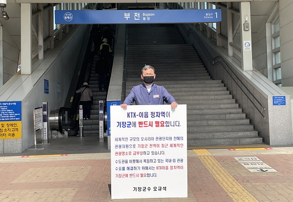 부산 기장군은 오규석 기장군수가 26일 오전 11시 부전역 앞에서 ‘KTX 이음 노선의 정차역’ 기장군 내 유치를 촉구하는 1인 시위를 진행했다고 밝혔다.