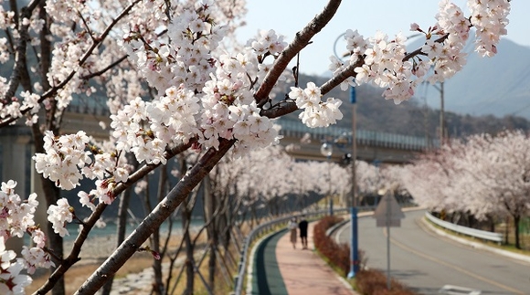 26일 경남 산청군 산청읍 항노화산들길 중 '느림의 길' 구간에 벚꽃이 만개했다. 지난 2019년 경호강변 벚꽃길 등으로 조성한 항노화산들길은 산청읍 전체를 한 바퀴 둘러볼 수 있는 6.5km의 걷기 길로 '느림의 길', '청춘의 길', '명상의 길' 등 구간별 테마를 가진 코스로 이뤄졌다. (사진=산청군 제공)