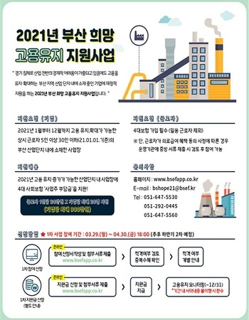 부산시가 지난해 시행한 ‘부산 희망 고용유지 특화업종 지원사업’을 올해도 추진해 코로나19 경기침체에도 고용을 유지하는 산업단지(산단) 소재 기업을 29일부터 지원한다고 발표했다.