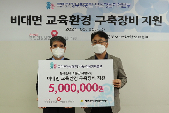 국민건강보험공단 부산경남지역본부는 지난 26일 부산지역자활센터협회에서 ‘비대면 교육환경 구축장비 지원금’ 전달식을 가졌다.