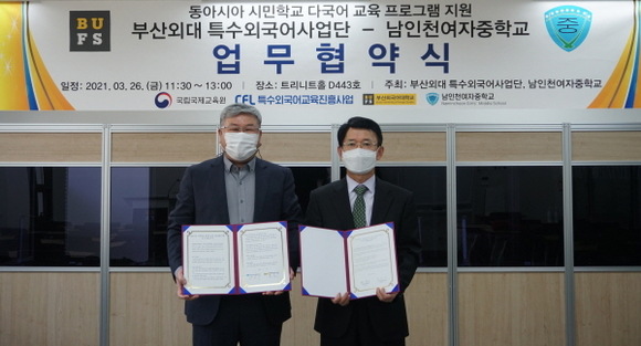 부산외국어대학교 특수외국어사업단은 지난 26일 남인천여자중학교와 특수외국어교육진흥사업 발전을 위한 업무협약을 체결했다고 29일 밝혔다.