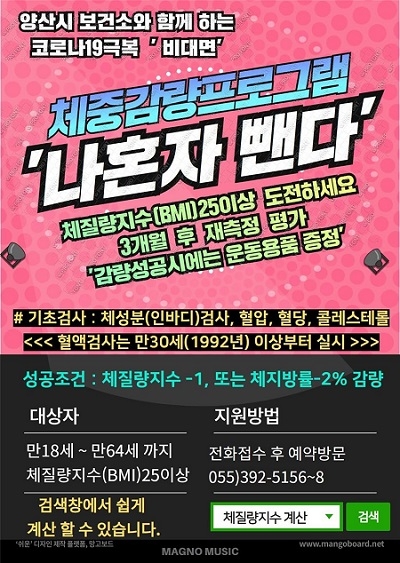 만18~64세 중 체질량지수(BMI) 25Kg/㎡ 이상인 양산시민이면 누구나 참여 가능하고 양산시보건소 1층 건강증진실로 전화접수 후 방문하면 된다.