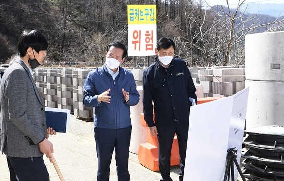 먼저 고제면 개명리 백두대간 경계 구역에 자리한 빼재 산림레포츠파크 조성사업장을 찾아 공사 진도와 문제점들을 꼼꼼히 살폈다.