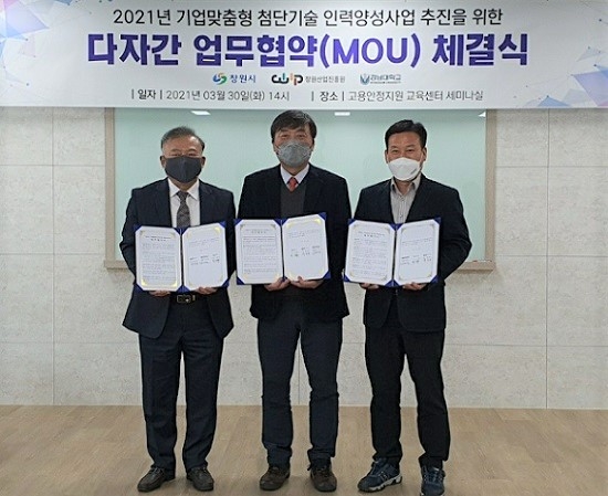 경남 창원시는 30일 '기업맞춤형 첨단기술 인력양성사업'의 원활한 추진을 위해 사업 참여기관인 창원산업진흥원, 경남대 산학협력단과 함께 업무협약을 체결했다.