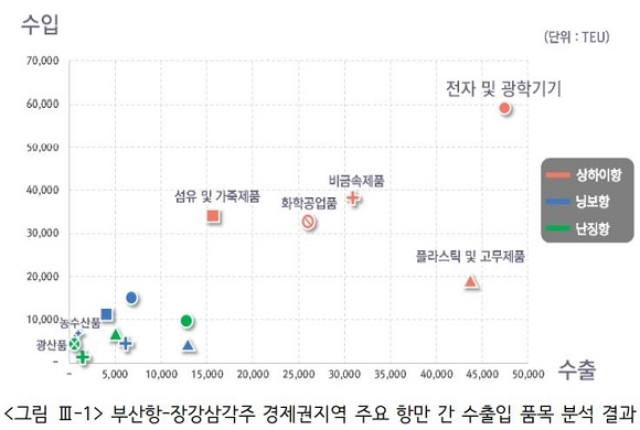 장강삼각주 경제권과 동남권의 수출입 품목을 분석한 결과 수출은 ‘플라스틱’ ‘고무제품’ ‘비금속제품’ 등의 순으로, 수입은 ‘비금속제품’ ‘전자·광학기기’ 등의 순으로 나타났다. 특히 전자·광학기기 가운데 원자로, 보일러, 기계류와 관련된 부품 등은 해상운송이 유리한 품목으로 부산의 전통산업인 조선, 조선기자재산업과 연관성이 크다.