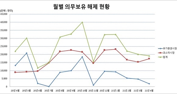 내달 중 의무보유가 해제되는 주식 수량은 전월에 비해 4.5%(899만주) 감소했으며 전년 동월과 비교하면 13.0%(2875만주) 감소한 수치다.