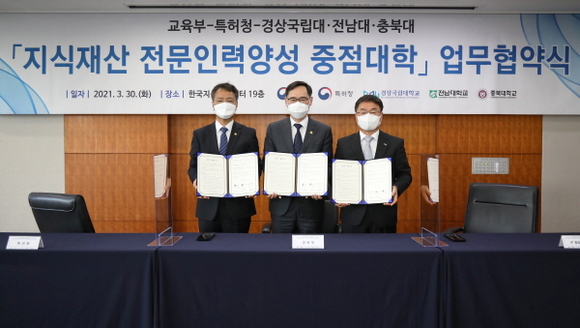 경상국립대학교(GNU)는 지난 30일 오후 4시 한국지식재산센터 대회의실에서 교육부-특허청-경상국립대 간에 ‘2021년 IP중점대학’ 업무협약을 체결했다고 밝혔다.