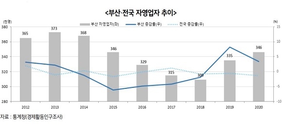 그러면서 “부산의 자영업자 증가는 일반적으로 무급 가족 종사자 증가를 수반함에 따라 고용의 질적 저하로 연결되는 경향이 있다”며 “무급 가족 종사자는 한계 생산력이 매우 낮은 수준으로 잠재적 실업자의 성격이 강하기 때문에 실업률을 과소평가할 가능성도 있다”고 지적했다.