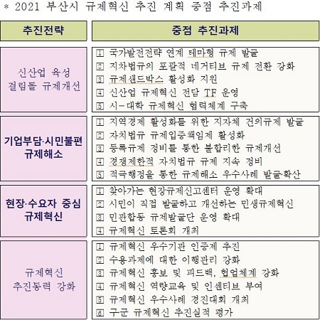 부산시가 코로나19 사태 등으로 침체한 부산 경제 회복과 시민 및 기업이 체감하는 규제혁신을 목표로 ‘2021 규제혁신 추진계획’을 수립해 추진한다고 2일 발표했다.
