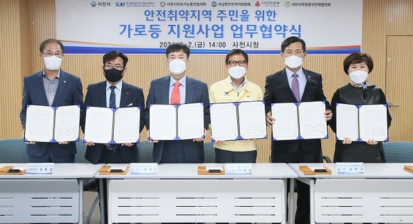 경남 사천시와 한국항공우주산업(KAI)가 2일 시청에서 안전취역지역 주민을 위한 가로등 지원사업 업무협약을 체결했다.