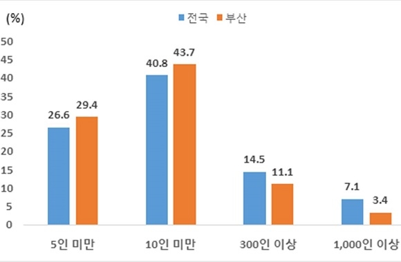 특히 부산은 전국적 경제 위기 시 대체적으로 큰 영향을 받는 ‘10인 미만 영세사업체’ 종사자 비중이 지난 2019년 기준 43.7%로 전국 평균치인 40.8%에 비해 높게 나타난다. ‘300인 이상 기업’ 종사자 비중은 11.1%에 그쳐 전국 평균치인 14.5%보다 낮은 상황이다.