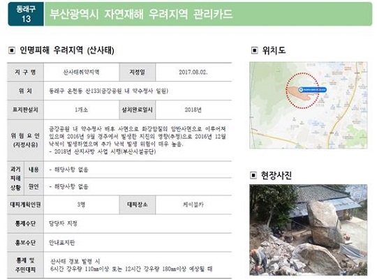 이러한 상황에서 시는 16개 구·군의 전수조사를 통해 ‘자연재해 우려 지역 관리대장’을 작성했다. 이는 총 344곳의 관리지역별로 ▲재해 우려지 종류 ▲위치도 ▲현장 사진 등을 수록했다.