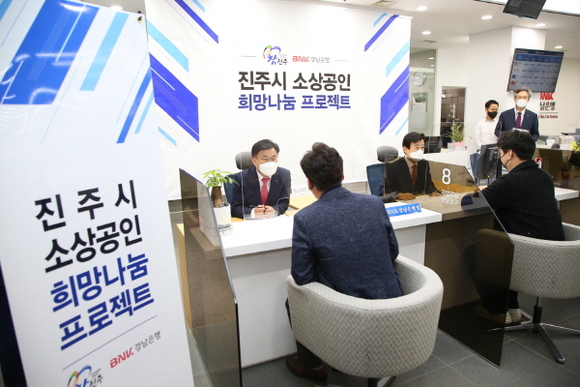 BNK경남은행 최홍영 은행장과 진주시 조규일 시장이 ‘소상공인 희망나눔 프로젝트’에 참석해 지역 소상공인을 대상으로 경영컨설팅을 하고 있다. (사진=경남은행 제공)