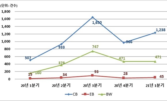 종류별 행사 건수는 CB가 1238건으로 직전분기 대비 28.2%(272건), EB는 45건으로 직전분기 대비 60.7%(17건) 각각 늘었으며 BW는 471건으로 직전분기와 동일한 수치를 기록했다.
