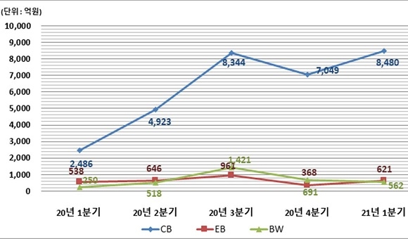 또 행사 금액은 CB가 8480억원으로 직전분기 대비 20.3%(1431억원), EB가 621억원으로 직전분기 대비 68.8%(253억원)씩 각각 늘었다. 반면 BW는 562억원으로 직전분기에 비해 18.7%(129억원) 감소한 모습을 보였다.