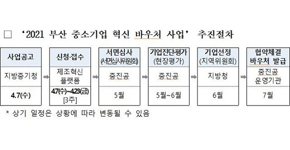 부산지방중소벤처기업청(부산중기청)이 중소벤처기업부(중기부)에서 공고한 ‘2021 중소기업 혁신 바우처 사업계획’에 따라 사업에 참여할 부산 소재 기업을 모집한다고 7일 안내했다.