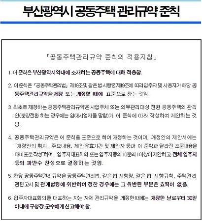 한편 개정된 관리규약 준칙 전문은 부산시 홈페이지 내 고시공고란에서 확인할 수 있다.