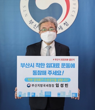 임성빈 부산지방국세청장은 7일 코로나19로 어려움을 겪고 있는 소상공인의 임대료 부담을 경감하기 위한 부산시 '동고동락 챌린지' 캠페인에 동참했다.