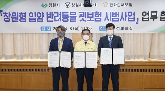 경남 창원시는 8일 오전 시정회의실에서 영남권 최초로 시행되는 창원형 입양 반려동물 펫보험 시범사업을 성공적으로 추진하기 위해 창원시수의사회, 한화손해보험(주)와 상호 협력을 위한 협약을 체결했다.