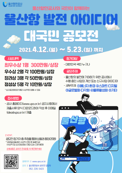 울산항만공사(이하 UPA)는 울산항의 미래 발전에 기여할 수 있는 국민 의견 수렴을 위해 4월 12일부터 5월 23일까지 ‘울산항 발전 아이디어 대국민 공모전’을 개최한다.