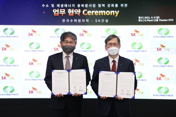 한국수력원자력(이하 한수원)이 지난 9일 서울 SK건설 본사에서 SK건설과 수소산업 활성화를 위한 ‘수소 및 재생에너지 융복합사업 협력 강화 업무협약(MOU)'을 체결했다.