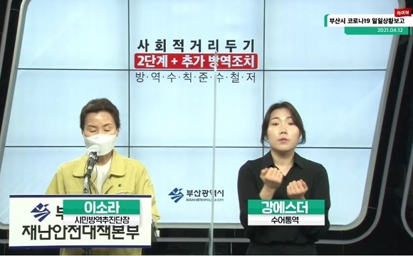 이소라 시민방역추진단장은 “어제 부산 복지시설 종사자 선제검사에서 1명의 확진자(4386번)가 발생해 해당 시설 종사자와 이용자 44명에 대한 검사한 결과, 7명이 추가 확진 판정을 받았다. 해당 센터는 종사자 11명, 이용자 14명 규모의 복지시설로 이전까지 시행했던 종사자 주 1회 선제검사에서는 모두 음성이 나왔었다”고 상황을 전하며 “아울러 금일 확진자 가운데 초등학생 1명, 어린이집 원생 1명이 포함돼 있어 방역당국은 두 시설에 대한 전수 조사를 진행하고 있다. 현재까지 자가격리자 수는 접촉자 8086명, 해외입국자 2933명으로 합계 1만 1019명이다”라고 현황을 설명했다.