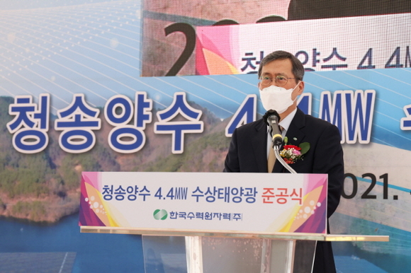 한수원은 청송양수발전소 하부댐 저수지 청송호에 4.4MW급 수상태양광발전소를 건설하고 13일 발전소 인근에서 준공식을 열었다. 이날 준공식에는 정재훈 한수원 사장을 비롯해 윤경희 청송군수, 이광호 청송군의회 의장, 강태욱 진영토건 부사장 등이 참석했다.