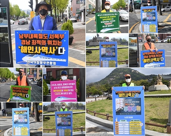 거창군 해인사역사유치추진위원회와 전국거창향우연합회는 국토교통부가 지난해 말에 공개한 남부내륙철도 전략환경영향평가(초안)에서 해인사역이 제외된 것에 반발해 13일부터 15일까지 청와대 분수대 앞에서 1인 시위를 전개하며 목소리를 높이고 있다.
