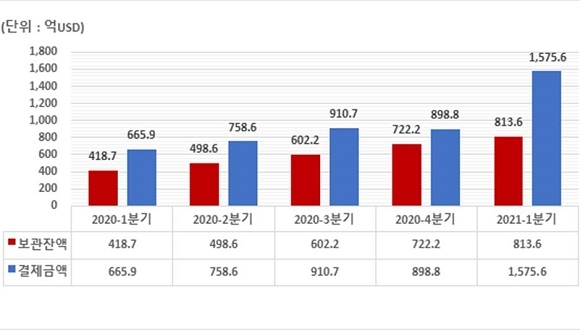이에 따르면 이번 분기 외화증권 결제금이 역대 최대치를 기록한 데 이어 보관금액은 813억 6000만 달러를 기록해 이 또한 역대 분기 최대치를 경신한 것으로 확인됐다.