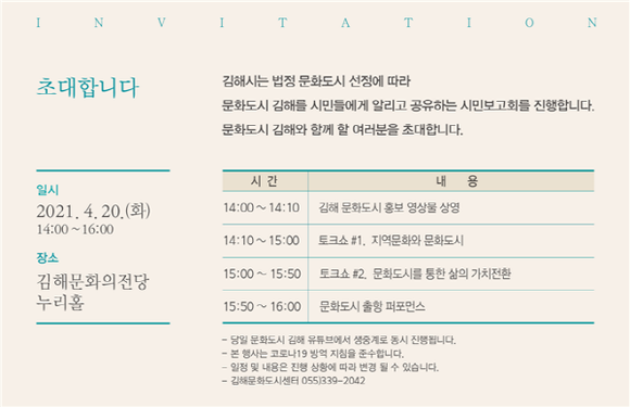 이번 행사는 거리두기 좌석제와 마스크 착용 등 방역 수칙을 준수해 진행하며, 코로나19 확산 방지를 위해 현장 참관을 최소화한다. 유튜브 채널 ‘문화도시김해’에서 온라인 생중계를 동시에 진행해 해당 행사를 누구나 시청할 수 있게 할 예정이다.