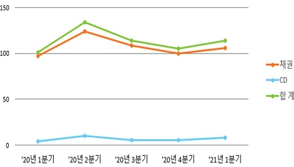 또 CD의 등록발행 규모는 약 8조 3000억원으로 전년동기 대비 107.5%(4조 3000억원) 증가했으며 직전분기 대비 53.7%(2조 9000억원) 늘어났다.