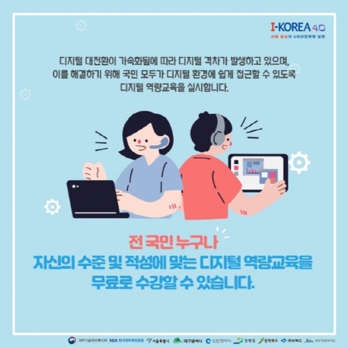 ‘전국민 디지털 역량강화 교육’을 통해 국민 누구나 일상생활에 필요한 디지털 기본 역량부터 취업연계 교육까지 집 근처에서 편하게 받을 수 있다. 정보화 교육의 필요성에 따라 도서관, 주민센터, 경로당 등 집 근처 생활 유휴 공간을 디지털 배움터로 활용해 국민의 디지털 역량교육 강화를 목적으로 하는 사업이다.