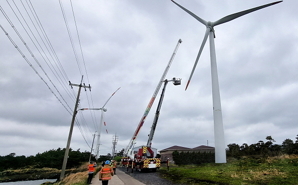 한국남부발전㈜ 남제주발전본부와 제주서부소방서가 풍력발전설비 화재 등 재난상황에 대비한 위기 대응 능력을 갖추기 위한 합동 소방훈련을 진행하고 있다. 훈련에 참석한 남부발전 김창환 남제주발전본부장은 “위기는 언제나 발생할 수 있다는 생각으로 설비 안정운영을 위해 평시 실전과 같은 위기대응 훈련을 시행하고 관계기관 협력체계를 강화하겠다”고 전했다. (사진=한국남부발전 제공)