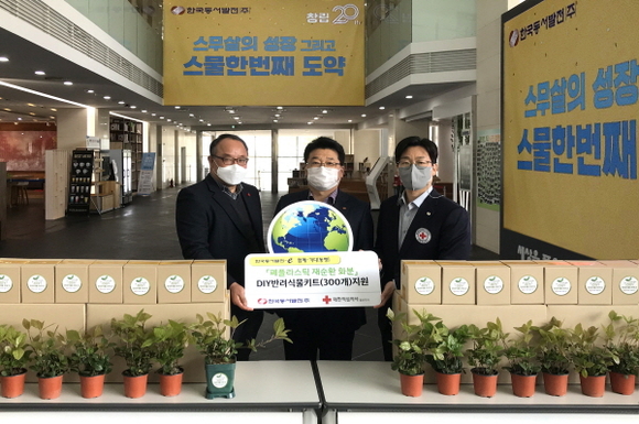 동서발전은 16일 본사에서 자원순환실천 캠페인을 통해 모은 폐플라스틱으로 직접 구성‧제작한 재생화분과 반려식물 키트 300세트 전달식을 가졌다.
