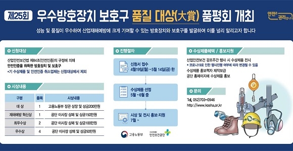 안전보건공단은 산하 산업안전보건인증원이 우수한 안전제품을 발굴해 산업 현장에 유통될 수 있도록 ‘제25회 방호장치·보호구 품질대상 품평회’를 개최한다고 19일 공고했다.