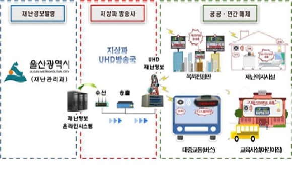 이에 따라 시가 재난경보를 송출하면 지역 내 텔레비전(TV) 방송 2개사(KBS, UBC) 중계시설을 통해 주요시설에 설치된 지상파 초고선명 방송망(UHD) 재난경보 전용수신기가 해당 정보를 수신해 모니터와 스피커로 정보를 표출하게 된다.